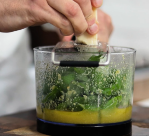 - Dodajte bosiljak i so da se dobije zelena pasta.